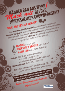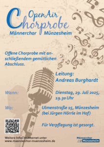 Der Männerchor Münzesheim verabschiedet sich am 29. Juli 25 mit seiner, bereits zurTradition gewordenen, Open Air Chorprobe in die Sommerpause.Chorleiter...